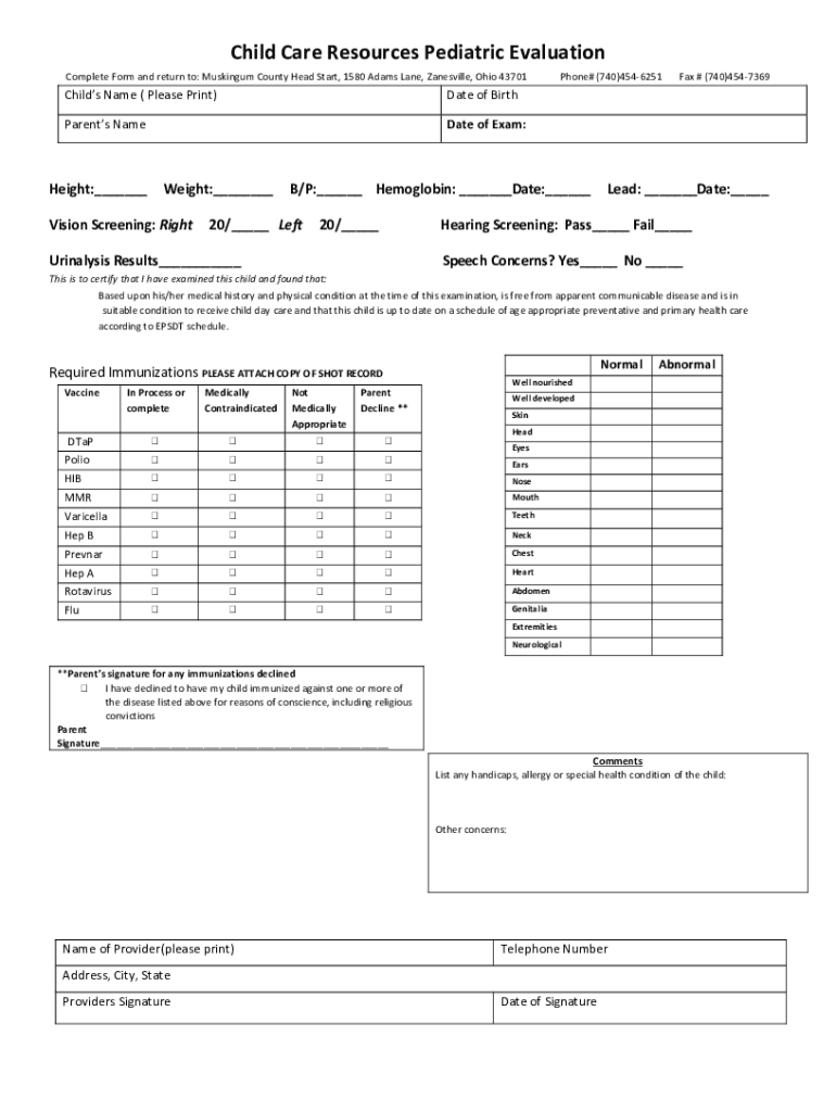 Child Care Resources Pediatric Evaluation Complete Form and return to: Masking County Head Start, 1580 Adams Lane, Janesville, Ohio 43701Childs Name (Please Print)Date of Birthmarks Name Date of Exam:Height: