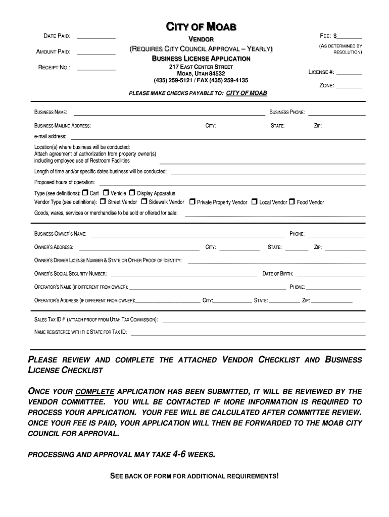 CITY OF MOAB DATE PAID: AMOUNT PAID: RECEIPT NO.: FEE: $ VENDOR (REQUIRES CITY COUNCIL APPROVAL YEARLY) BUSINESS LICENSE APPLICATION (AS DETERMINED BY RESOLUTION) 217 EAST CENTER STREET MOAB, UTAH