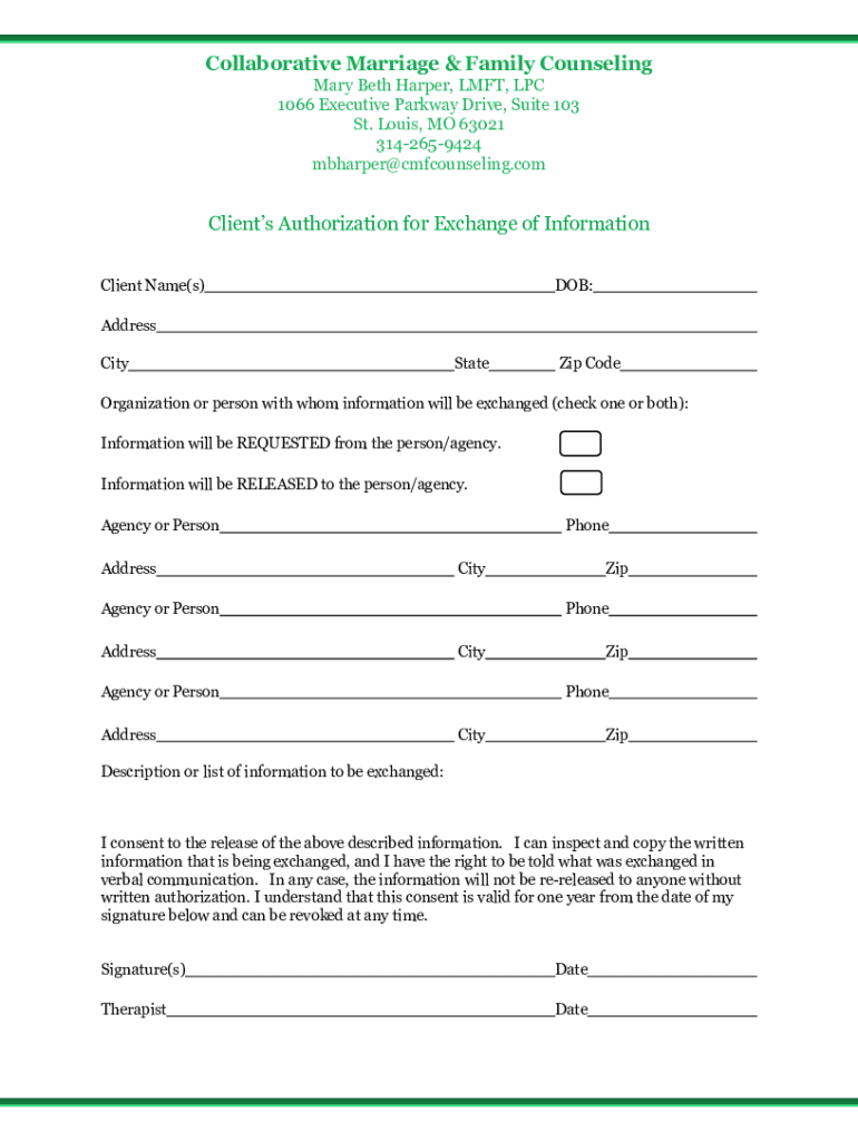 Collaborative Marriage & Family Counseling Mary Beth Harper, LEFT, LPC 1066 Executive Parkway Drive, Suite 103 St. Louis, MO 63021 3142659424 Harper counseling. Complaints Authorization for Exchange