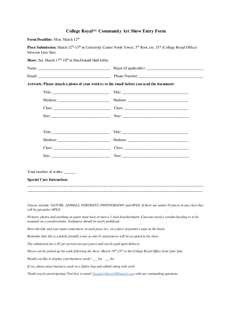 College Royalty Community Art Show Entry Form Deadline: Mon. March 12th Piece Submission: March 12th15th in University Center North Tower, 5th floor, rm. 537 (College Royal Office) between 1pm5pm