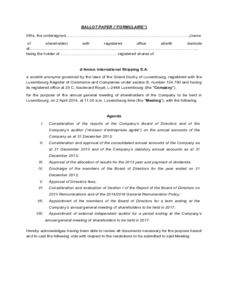 BALLOT PAPER (FORMULA IRE) I/We, the undersigned, .(name of shareholder) with registered office at/with domicile at....., being the holder of registered shares Adamic International Shipping S.A. a