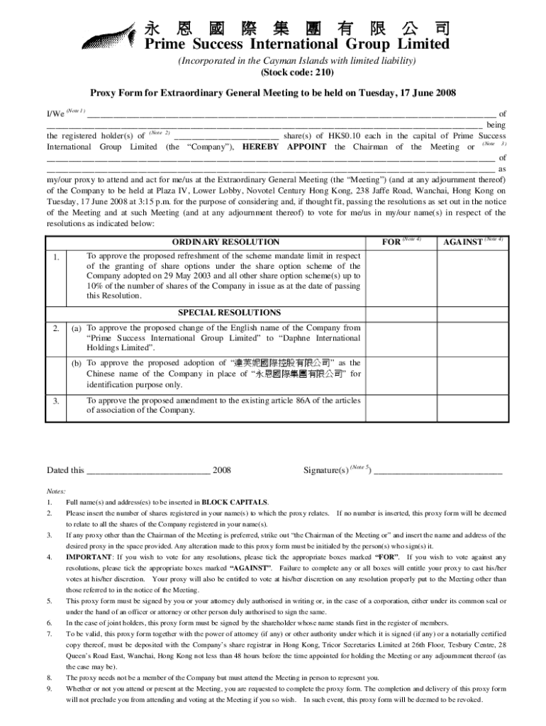 Prime Success International Group Limited (Incorporated in the Cayman Islands with limited liability) (Stock code: 210) Proxy Form for Extraordinary General Meeting to be held on Tuesday, 17 June