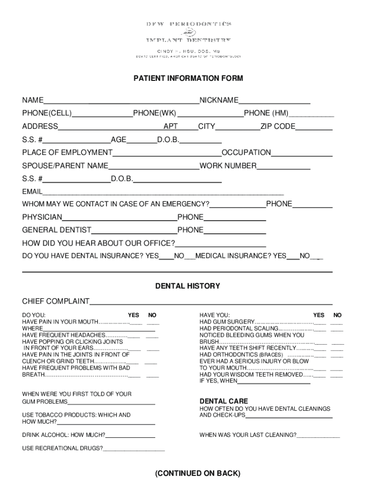 PATIENT INFORMATION FORM NAME PHONE(CELL)NICKNAME PHONE(WK)ADDRESS S.S. #PHONE (HM) APT RECITED. O.B.PLACE OF EMPLOYMENTOCCUPATIONSPOUSE/PARENT NAME S.S. #ZIP BODYWORK NUMBER D.O.B.EMAIL WHOM MAY