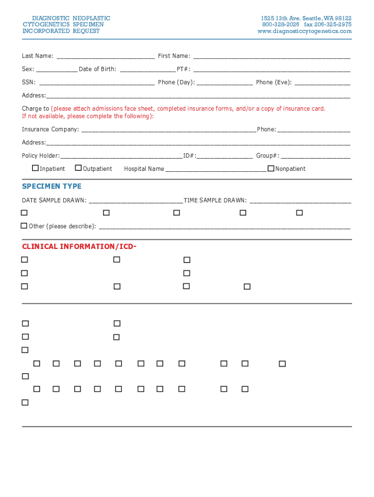 DIAGNOSTIC NEOPLASTIC CYTOGENETICS SPECIMEN INCORPORATED REQUEST REQUEST1525 13th Ave. Seattle, Seattle, WA 98122 98122 1525 13th Ave. 8003282026 fax 2063252975 2063252975 8003282026 www.diagnosticcytogenetics.com