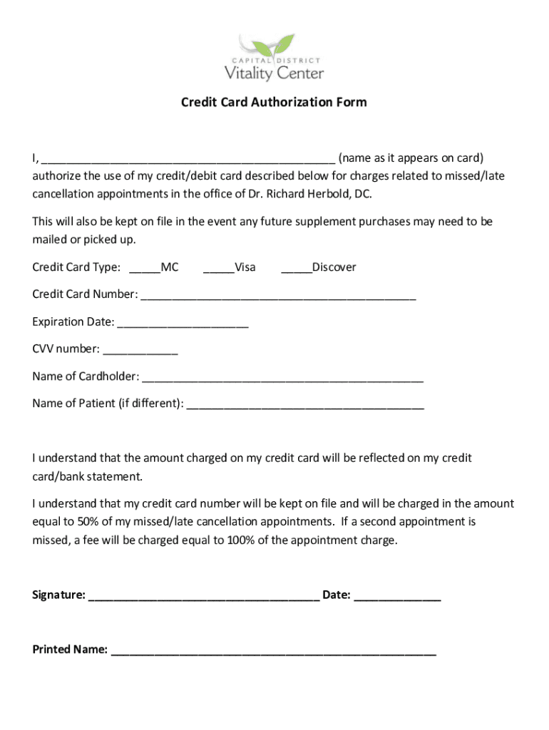 Credit Card Authorization Form, (name as it appears on card) authorize the use of my credit/debit card described below for charges related to missed/late cancellation appointments in the office of