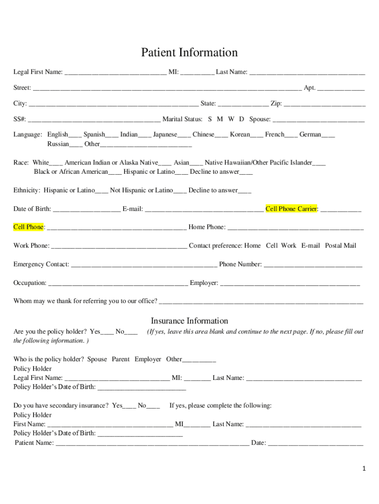 Patient Information Legal First Name: MI: Last Name: Street: Apt. City: State: Zip: SS#: Marital Status: S M W D Spouse: Language: English Spanish Indian Japanese Chinese Korean French German Russian