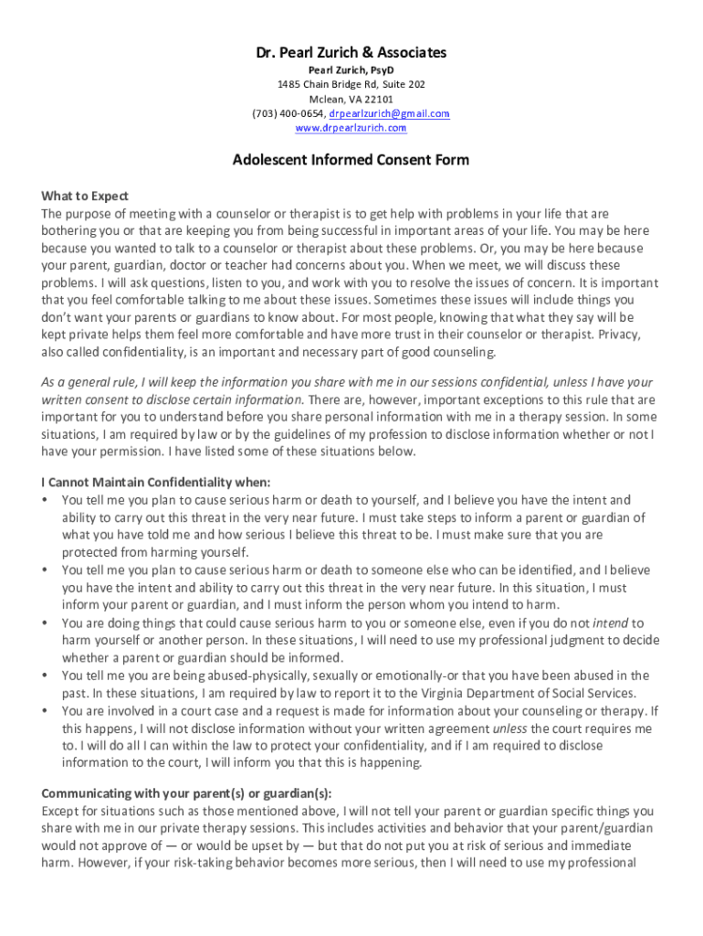 Dr. PearlZurich&Associates Pearl Zurich, PSD 1485ChainBridgeRd,Suite202 McLean,VA22101 (703)4000654,drpearlzurich gmail.com www.drpearlzurich.comAdolescentInformedConsentForm WhattoExpect Thepurposeofmeetingwithacounselorortherapististogethelpwithproblemsin.
