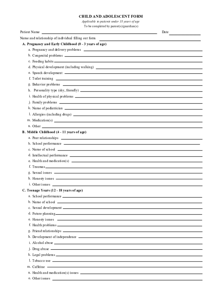 CHILD AND ADOLESCENT FORM Applicable to patients under 18 years of age To be completed by parent(s)/guardian(s)Patient Name and relationship of individual filling out form A. Pregnancy and Early Childhood
