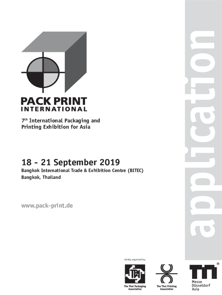 18 21 September 2019Bangkok International Trade & Exhibition Center (BITE) Bangkok, Thailand. Pack print. Jointly organized by:application7th International Packaging and Printing Exhibition for AsiaA1Space