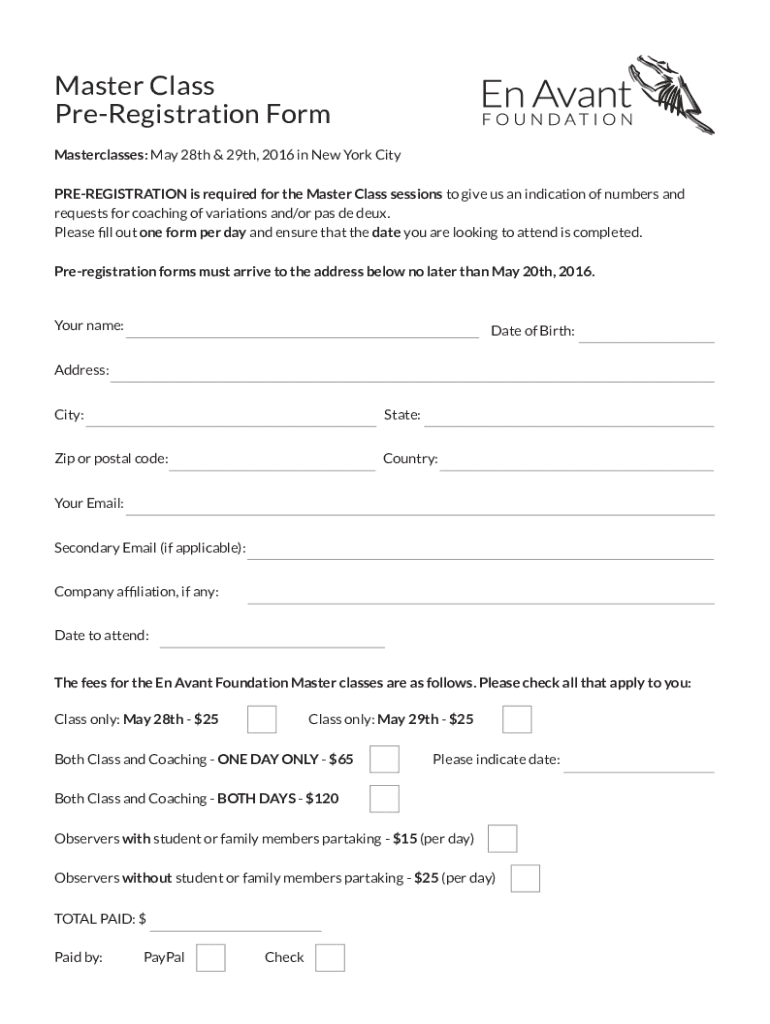 Get the free PDF Master Class Pre-Registration Form - En Avant Foundation