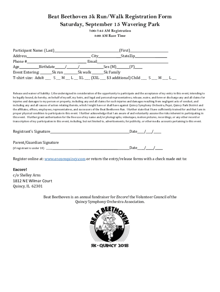 Beat Beethoven 5k Run/Walk Registration Form Saturday, September 15 Wavering Park 7:007:45 AM Registration 8:00 AM Race TimeParticipant Name: (Last) (First) Address City State Phone # Email Age Birthdate