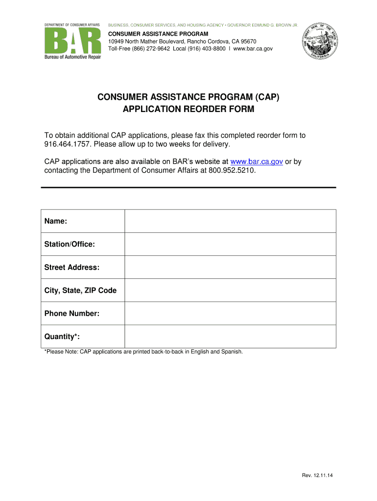 The California Consumer Assistance Program Application Reorder Form is an application form used by California residents to request additional CAP applications.