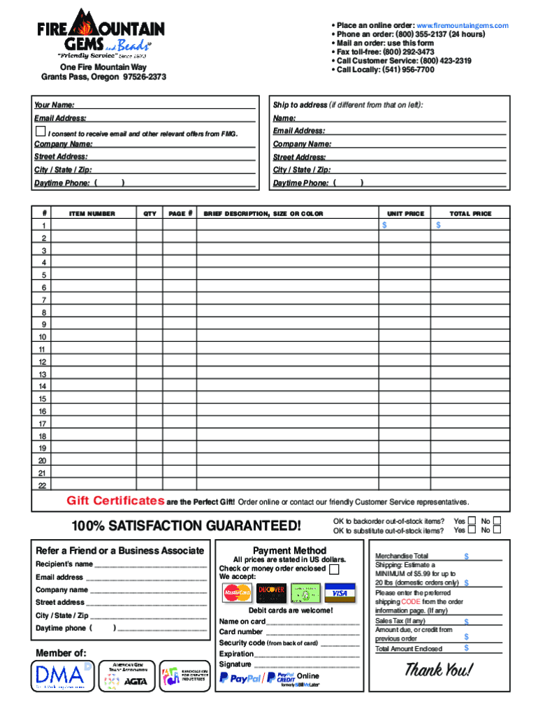 One Fire Mountain Way Grants Pass, Oregon 975262373Your Name:Ship to address (if different from that on left):Email Address:Name: I consent to receive email and other relevant offers from FMG. Email