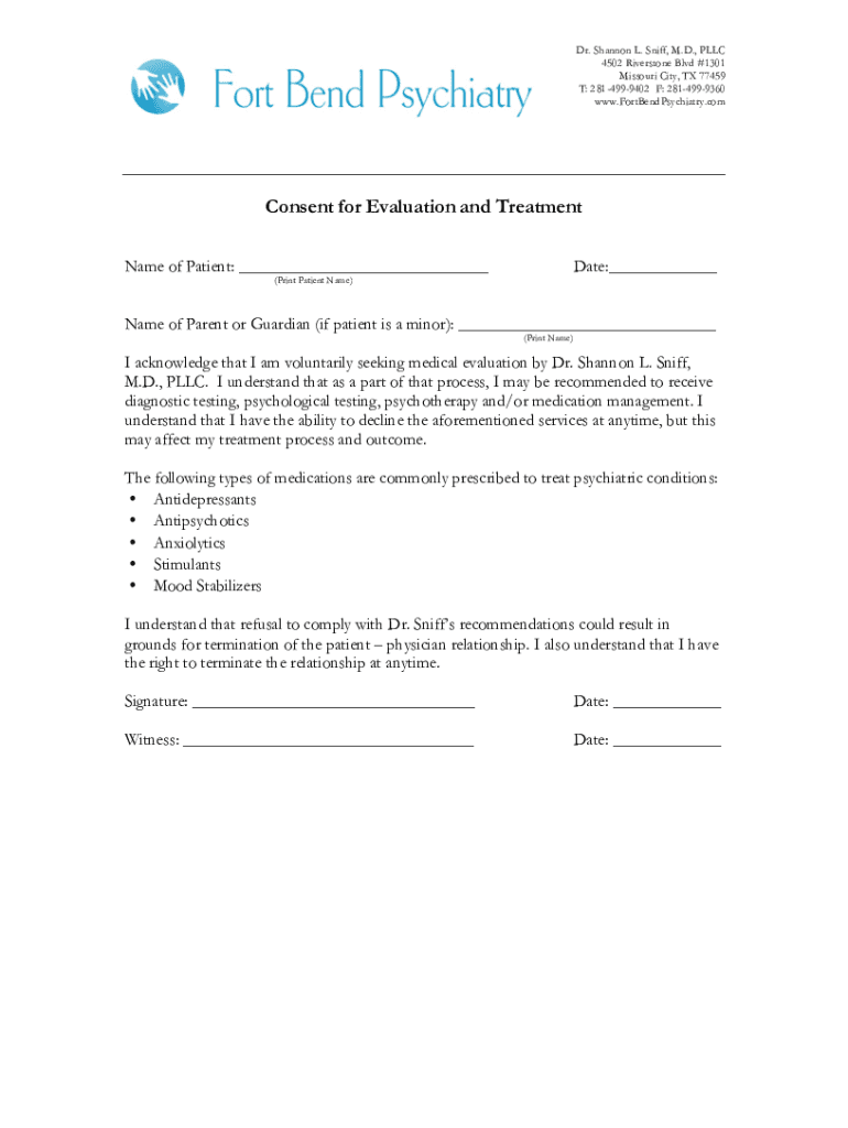 Dr. Shannon L. Sniff, M.D., LLC 4502 River stone Blvd #1301 Missouri City, TX 77459 T: 2814999402 F: 2814999360 www.FortBendPsychiatry.comConsent for Evaluation and Treatment Name of Patient: Date: