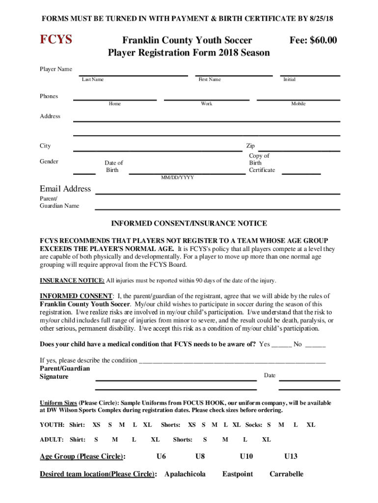 FORMS MUST BE TURNED IN WITH PAYMENT & BIRTH CERTIFICATE BY 8/25/18FCYSFranklin County Youth Soccer Player Registration Form 2018 Seasoned: $60.00Player Name Last NameFirst NameInitialPhones HomeWorkMobileAddressCityZipGenderCopy