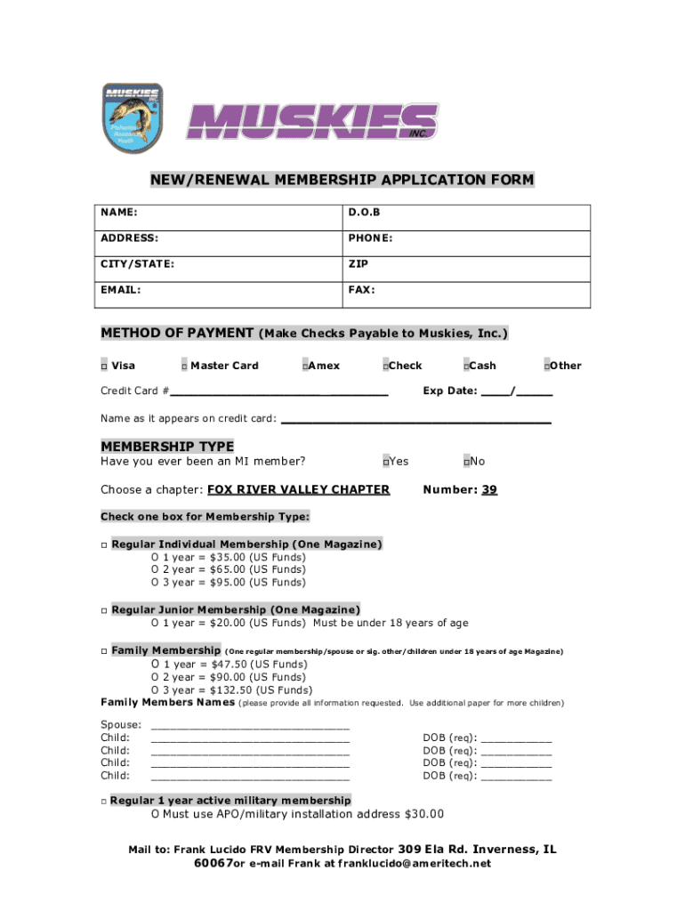 NEW/RENEWAL MEMBERSHIP APPLICATION FORM NAME:D.O.ADDRESS:PHONE:CITY/STATE:EMAIL:FAX:METHOD OF PAYMENT (Make Checks Payable to Muskies, Inc.) Visa Master CardAmexCredit Card # Check CashOtherExp Date:
