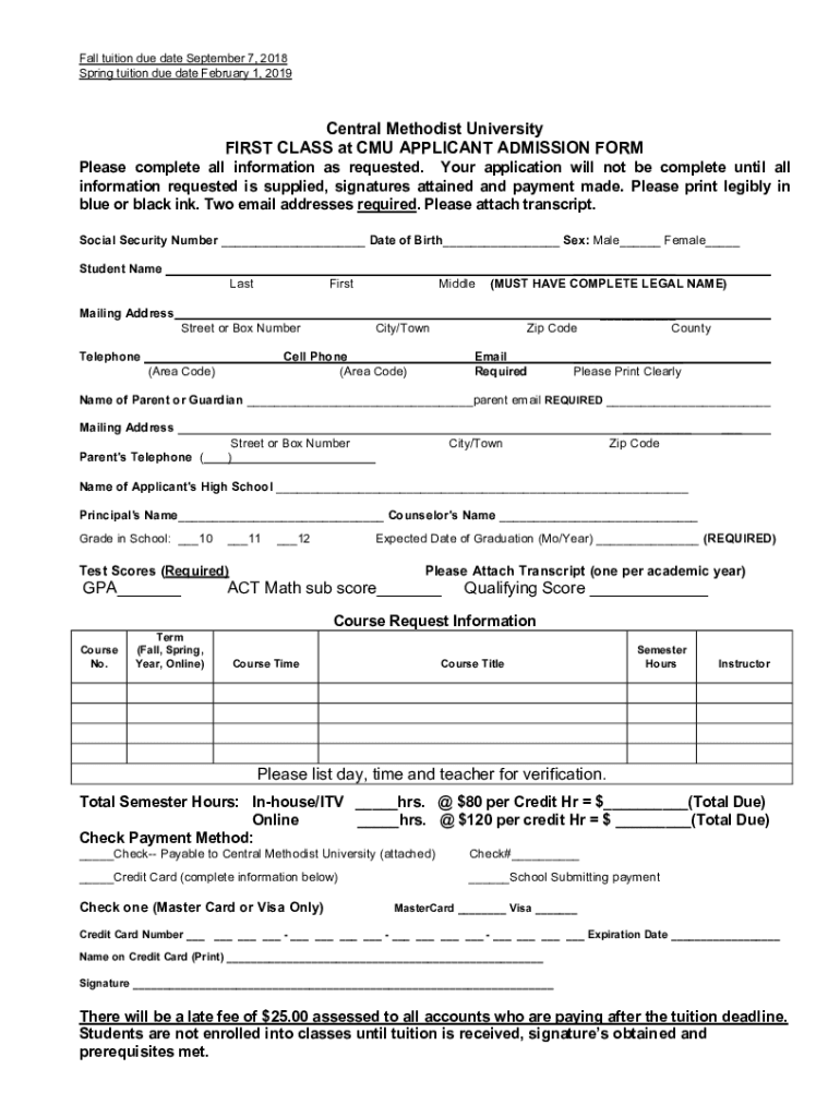 Fall tuition due date September 7, 2018, Spring tuition due date February 1, 2019Central Methodist University FIRST CLASS at CMU APPLICANT ADMISSION FORM Please complete all information as requested.