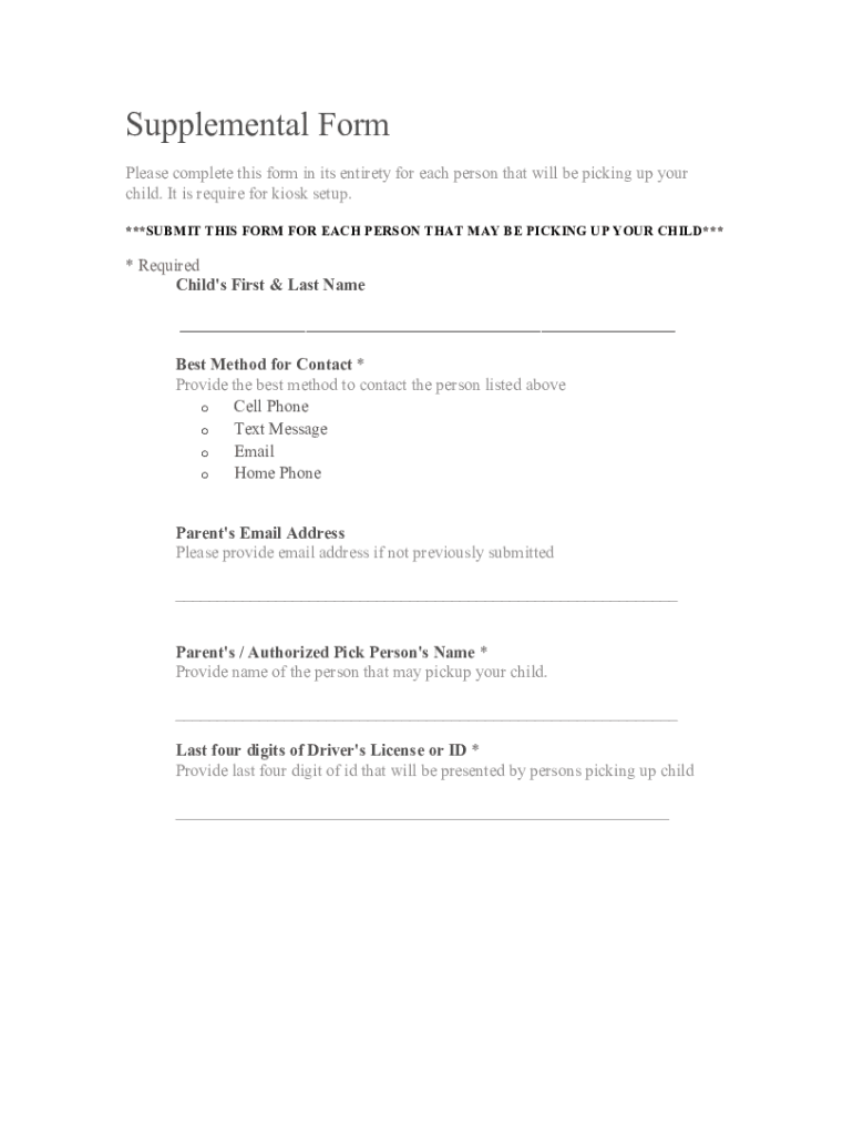 Supplemental Form Please complete this form in its entirety for each person that will be picking up your child. It is required for kiosk setup. ***SUBMIT THIS FORM FOR EACH PERSON THAT MAY BE PICKING