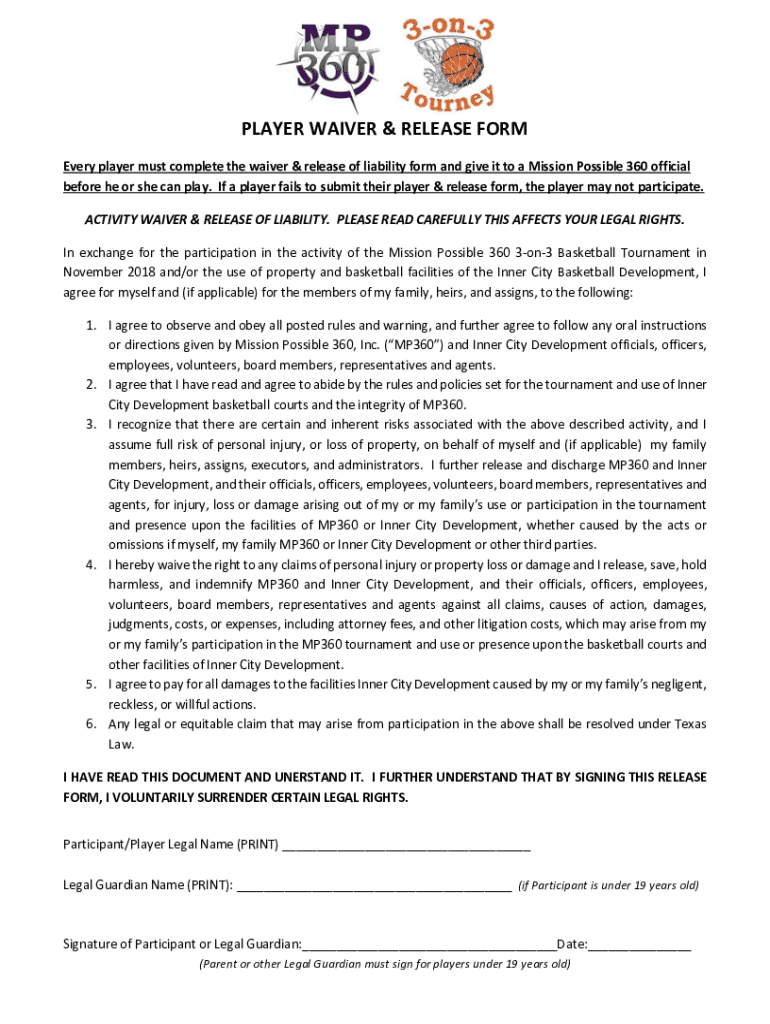 PLAYER WAIVER & RELEASE FORM Every player must complete the waiver & release of liability form and give it to a Mission Possible 360 official before he or she can play. If a player fails to submit