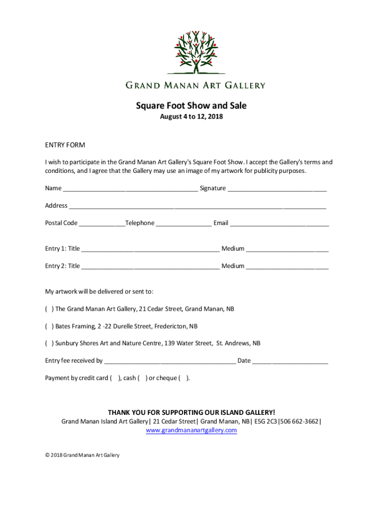 Square Foot Show and Sale August 4 to 12, 2018ENTRY FORM I wish to participate in the Grand Mann Art Gallery's Square Foot Show. I accept the Gallery's terms and conditions, and I agree that the Gallery