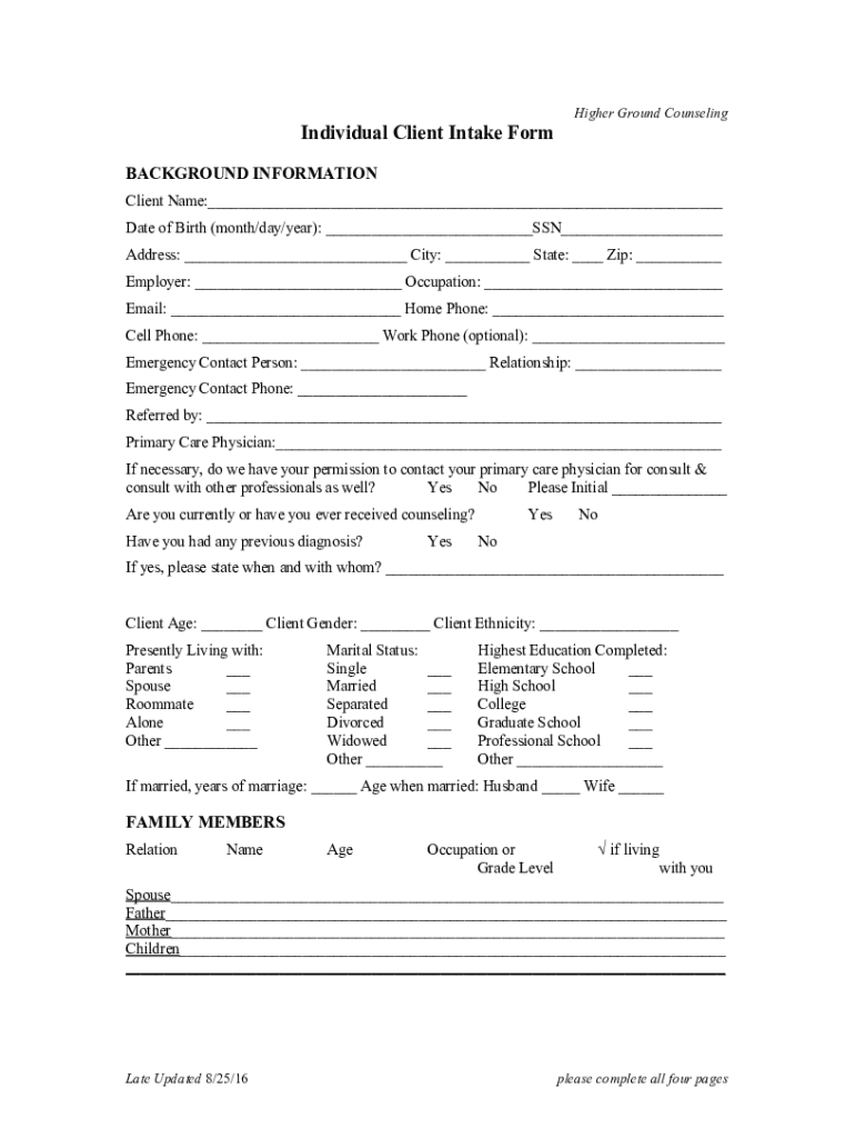 Higher Ground CounselingIndividual Client Intake Form BACKGROUND INFORMATION Client Name: Date of Birth (month/day/year): SSN Address: City: State: Zip: Employer: Occupation: Email: Home Phone: Cell