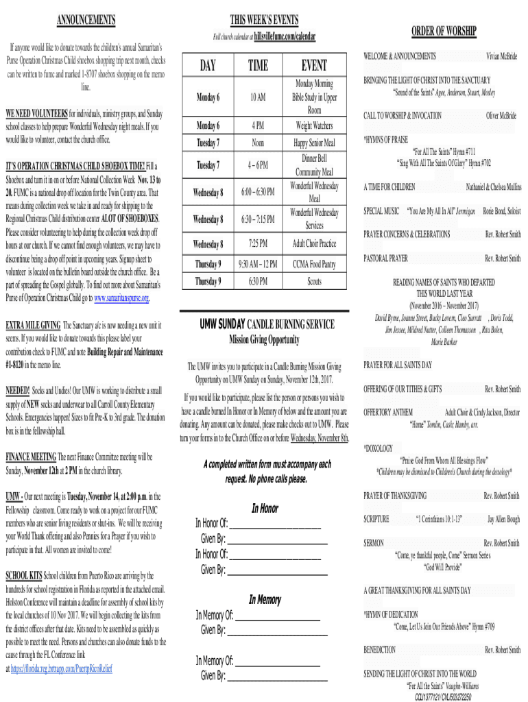 Fill out your announcements this weeks events online with pdfFiller!