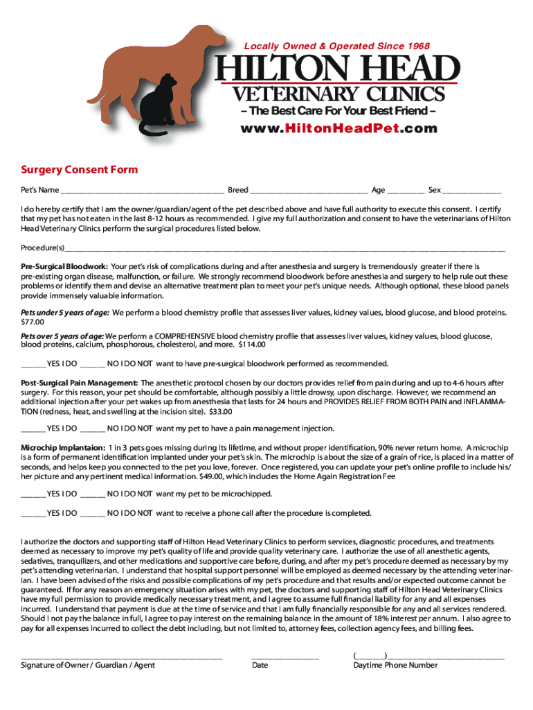 Locally Owned & Operated Since 1968HILTON HEAD VETERINARY CLINICS The Best Care For Your Best Friend www.HiltonHeadPet.com Surgery Consent Form Pets Name Breed Age Sex I do hereby certify that I am