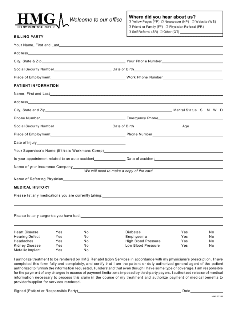 Welcome to our officeWhere did you hear about us? Yellow Pages (YP) Newspaper (NP) Website (WS) Friend or Family (FF) Physician Referral (PR) Self Referral (SR) Other (OT)BILLING PARTY Your Name,
