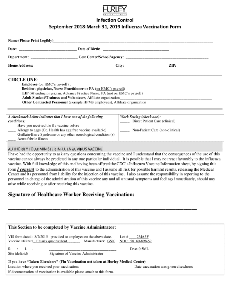 Infection Control September 2018March 31, 2019 Influenza Vaccination Form Name (Please Print Legibly) Date: Date of Birth: Department: Cost Center/School/Agency: Home Address: City: ZIP: CIRCLE ONE: