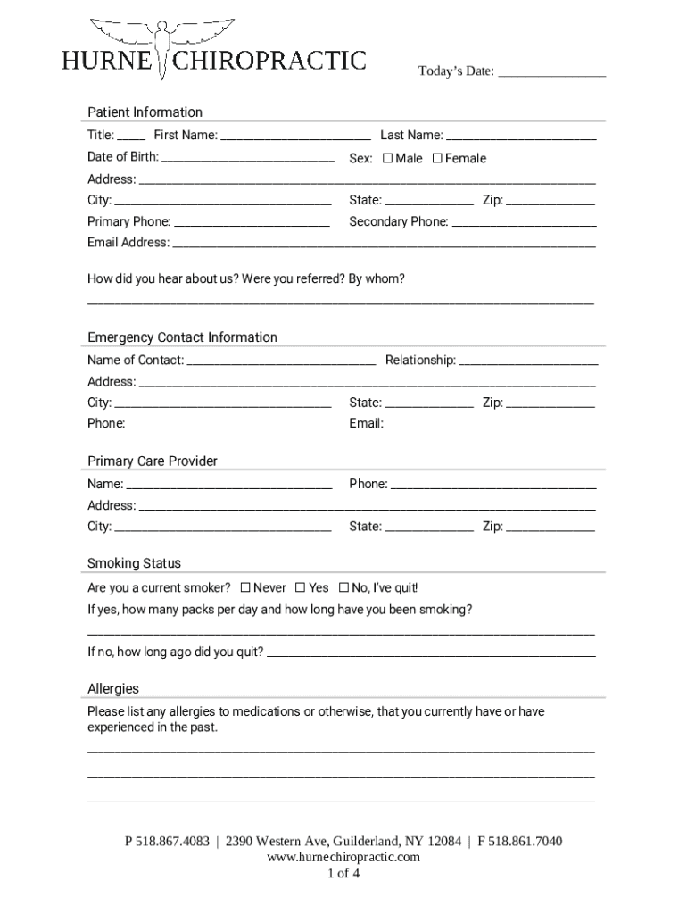 Today's Date: Patient Information Title: First Name: Last Name: Date of Birth: Sex: Male FemaleAddress: City: State: Zip: Primary Phone: Secondary Phone: Email Address: How did you hear about us?
