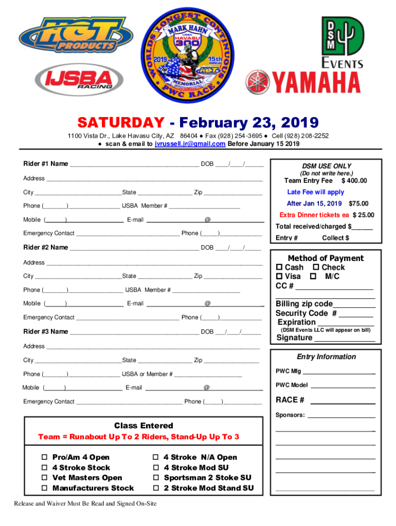 SATURDAY, February 23, 2019 1100 Vista Dr., Lake Havasu City, AZ 86404 Fax (928) 2543695 Cell (928) 2082252 scan & email to Russell.jr gmail.com Before January 15, 2019, Rider #1 Name DOB / / Address