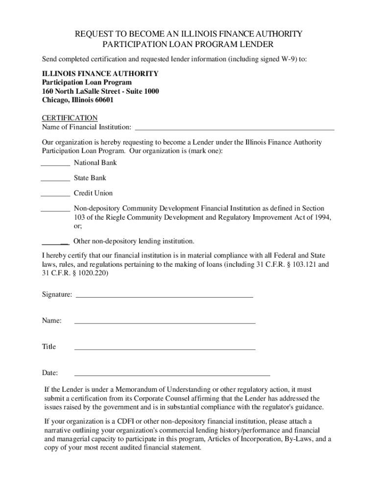REQUEST TO BECOME AN ILLINOIS FINANCE AUTHORITY PARTICIPATION LOAN PROGRAM LENDER Send completed certification and requested lender information (including signed W9) to: ILLINOIS FINANCE AUTHORITY