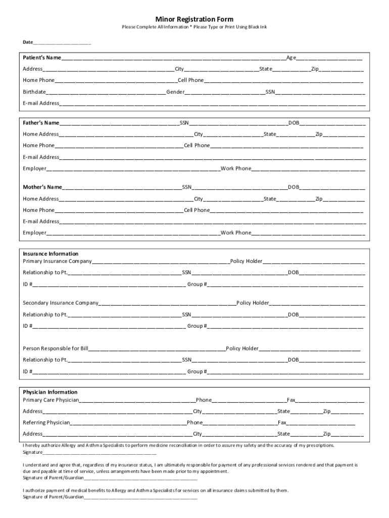 Minor Registration Form Please Complete All Information * Please Type or Print Using Black Ink Date Patients Name Age Address City State Zip Home Phone Cell Phone Birthdate Gender SSN Email Address