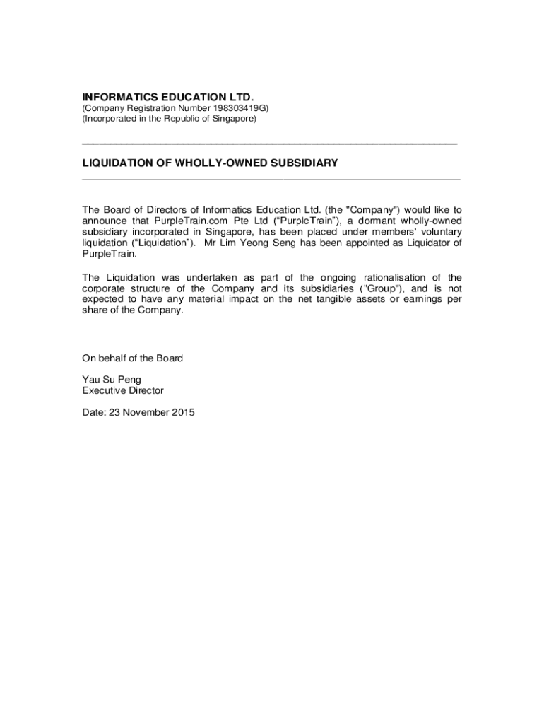 INFORMATICS EDUCATION LTD. (Company Registration Number 198303419G) (Incorporated in the Republic of Singapore) LIQUIDATION OF HOLLOWED SUBSIDIARY The Board of Directors of Informatics Education Ltd.