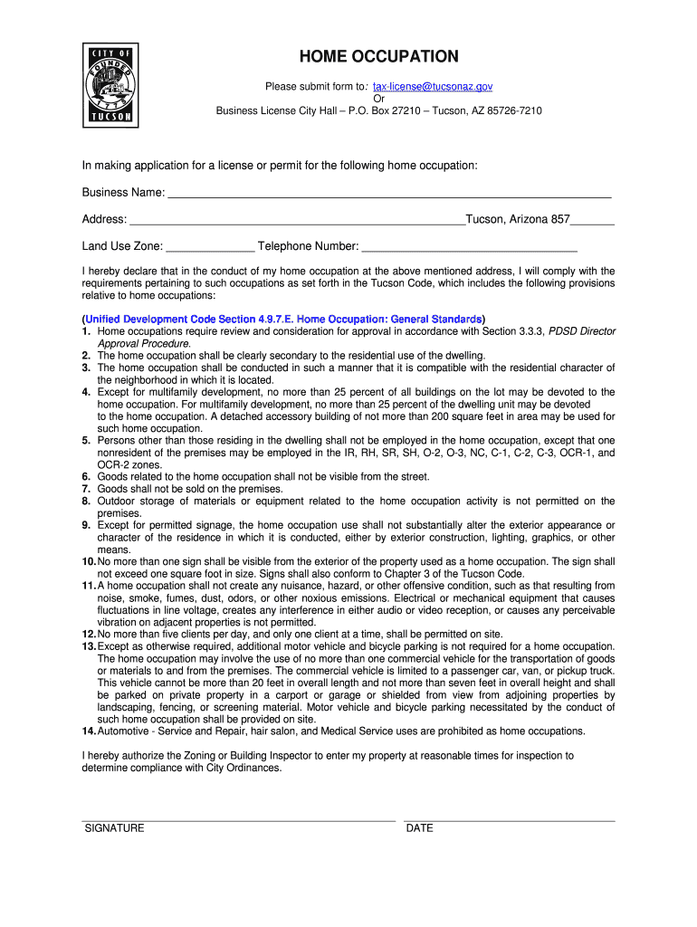 Eligibility Criteria for the Tucson Home Occupation License Application