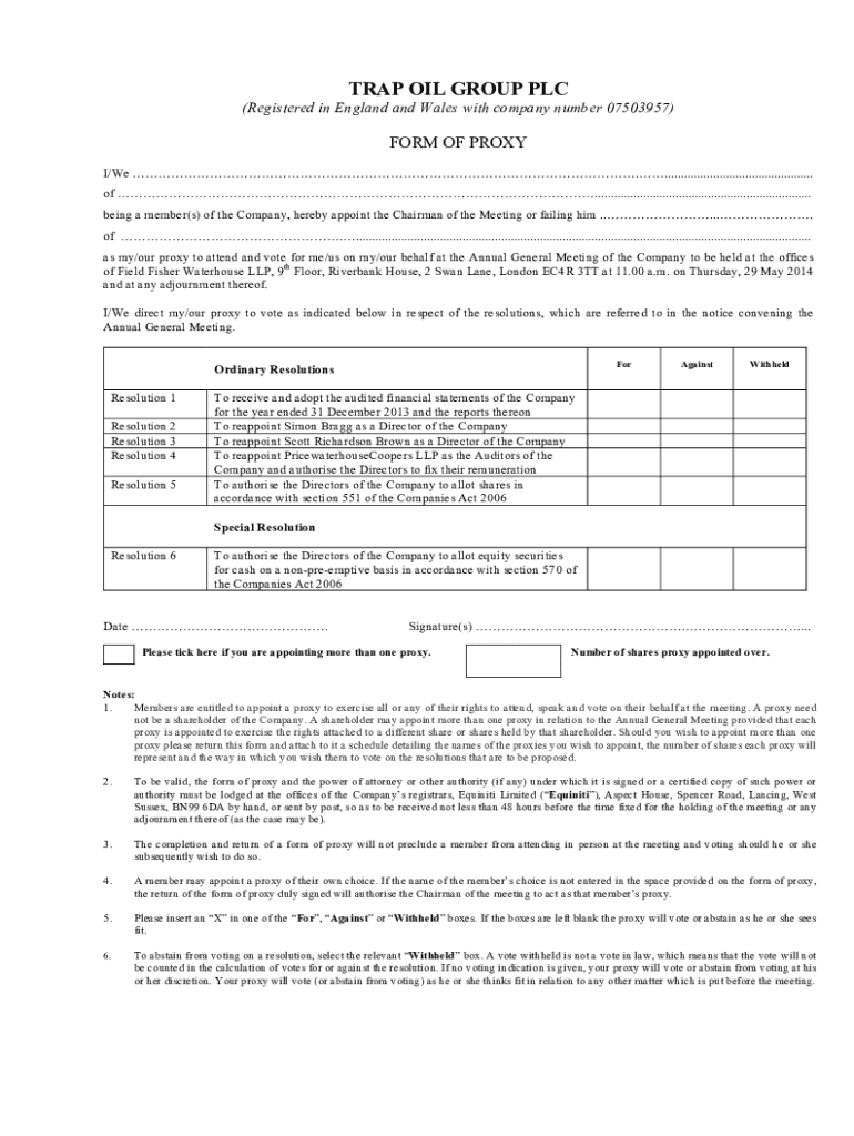 TRAP OIL GROUP PLC (Registered in England and Wales with company number 07503957)FORM OF PROXY I/We ............................................... of ...................................................................