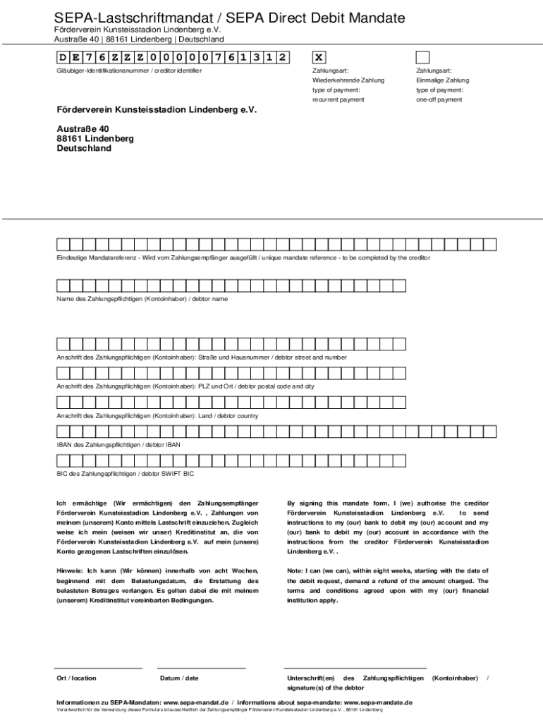 SEPALastschriftmandat / SEPA Direct Debit Mandate Frderverein Kunsteisstadion Linden berg e.V. Austral 40 88161 Linden berg Deutschland E 7 6 Z Z Z 0 0 0 0 0 7 6 1 3 1 2 GlubigerIdentifikationsnummer