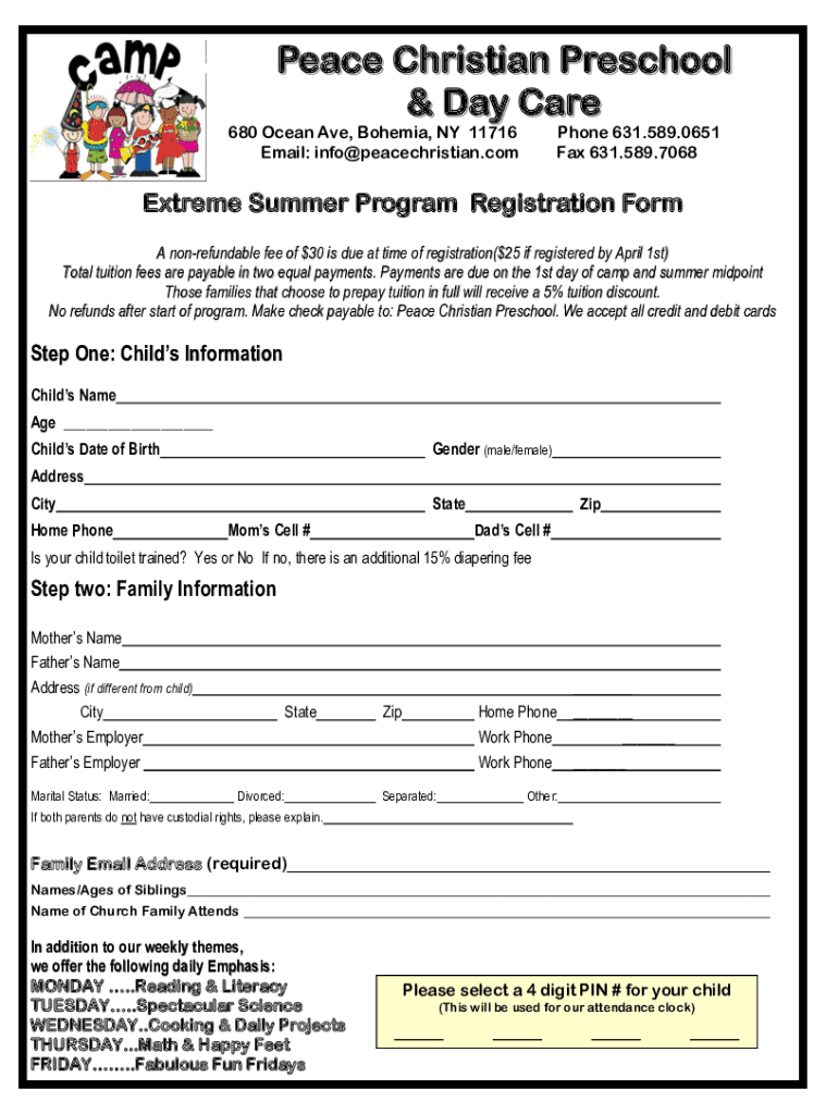 Peace Christian Preschool & Day Care680 Ocean Ave, Bohemia, NY 11716 Email: info peace Christian. Compose 631.589.0651 Fax 631.589.7068Extreme Summer Program Registration Form A non-nonrefundable