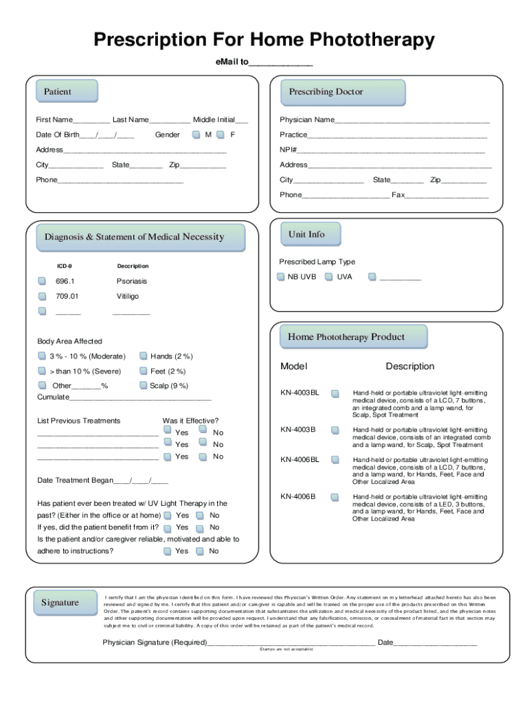 Prescription For Home Phototherapy email to PatientPrescribing DoctorFirst Name Last Name Middle Initial Physician Name Date Of Birth / / Practice GenderMFAddress NPI# City Address State Zip Phone