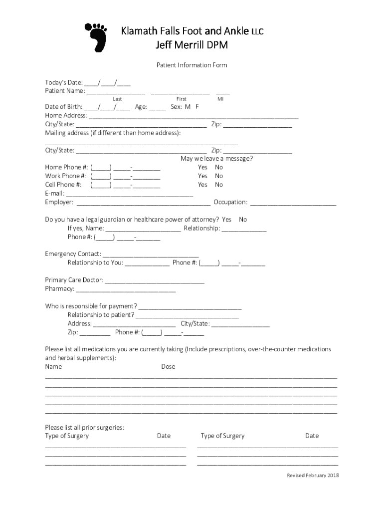 Klamath Falls Foot and Ankle LLC Jeff Merrill PM Patient Information Form Today's Date: / / Patient Name: LastFirstMIDate of Birth: / / Age: Sex: M F Home Address: City/State: Zip: Mailing address