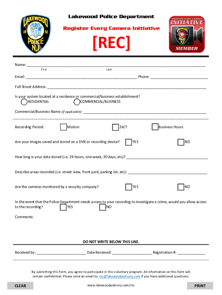 Lakewood Police Department Register Every Camera Initiative REC Name: FirstLastEmail: Phone: Full Street Address: Is your system located at a residence or commercial/business establishment? RESIDENTIAL