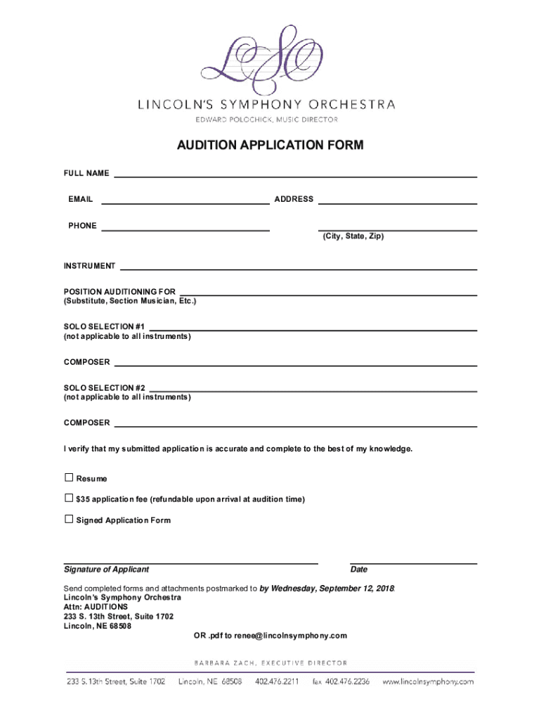 AUDITION APPLICATION FORM FULL NAME EMAILADDRESSPHONE (City, State, Zip)INSTRUMENT POSITION AUDITIONING FOR (Substitute, Section Musician, Etc.) SOLO SELECTION #1 (not applicable to all instruments)