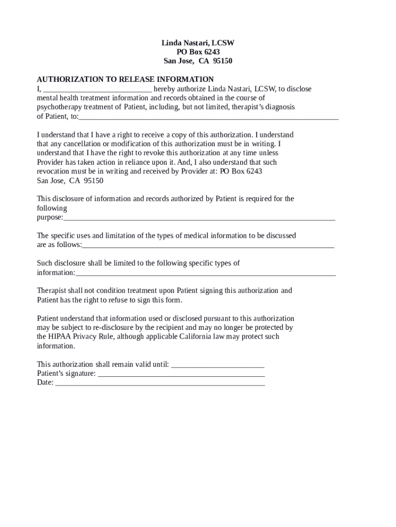 Linda NASTAR, LCSW PO Box 6243 San Jose, CA 95150 AUTHORIZATION TO RELEASE INFORMATION I, hereby authorize Linda NASTAR, LCSW, to disclose mental health treatment information and records obtained