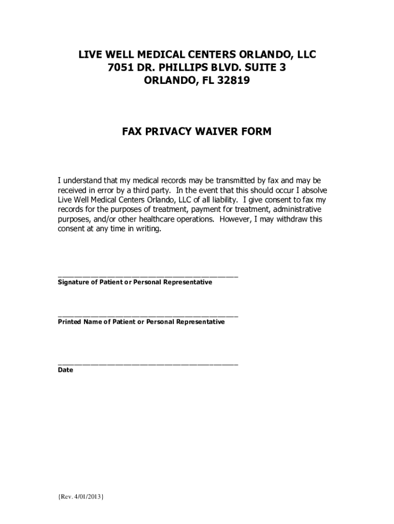 ORLANDO, FL 32819FAX PRIVACY WAIVER FORM understand that my medical records may be transmitted by fax and may be