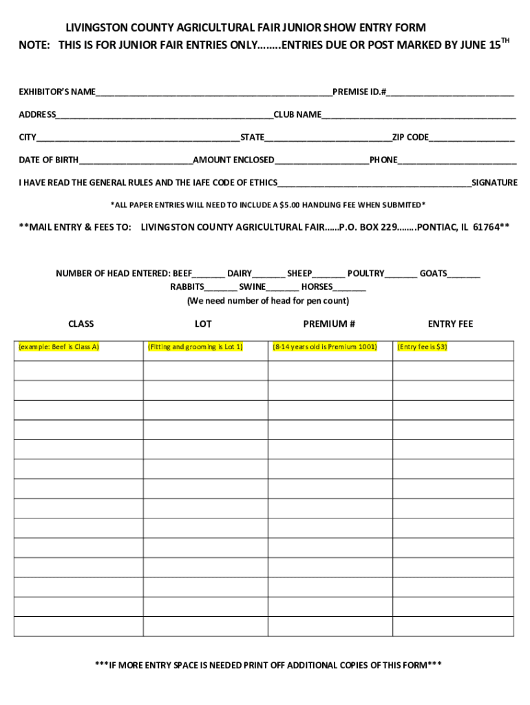 To fill out the junior fair entry form, participants should provide their personal information, details about their project or animal, and any required signatures, ensuring that all sections are completed accurately.