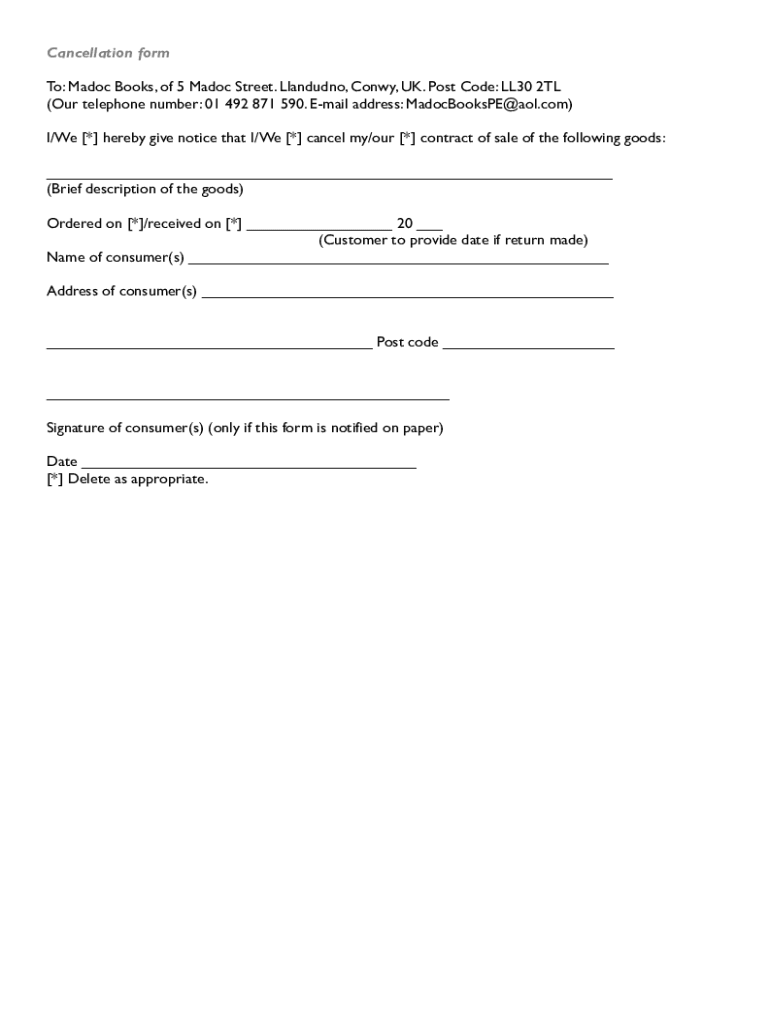 Cancellation form To: Madoc Books, of 5 Madoc Street. Llandudno, Conway, UK. Post Code: LL30 2TL (Our telephone number: 01 492 871 590. Email address: MadocBooksPE aol.com) I/We * hereby give notice