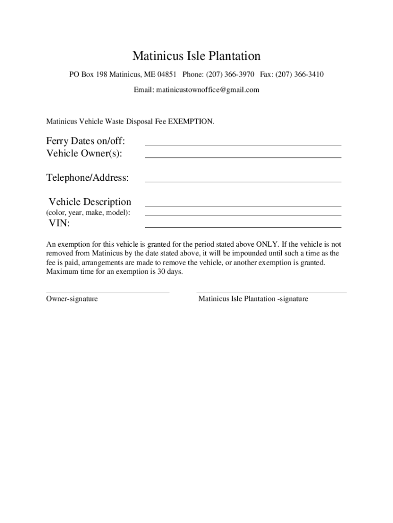 Matrices Isle Plantation PO Box 198 Matrices, ME 04851 Phone: (207) 3663970 Fax: (207) 3663410 Email: matinicustownoffice Gmail.comMatinicus Vehicle Waste Disposal Fee EXEMPTION. Ferry Dates on/off: