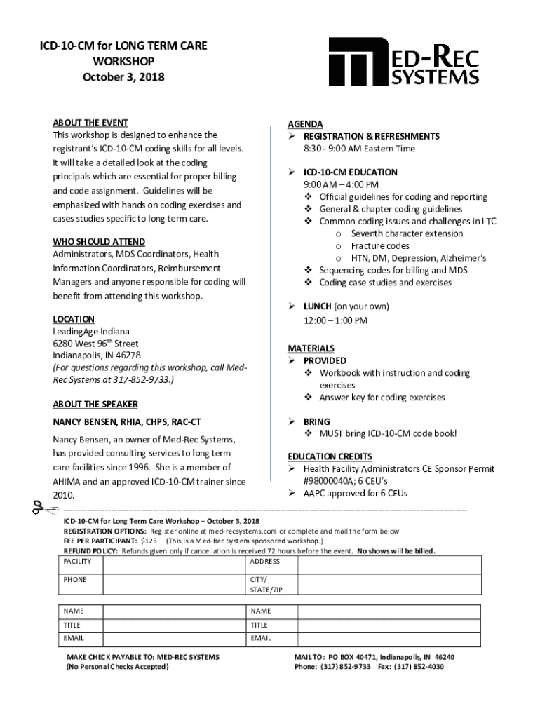 ICD10CM for LONG TERM CARE WORKSHOP October 3, 2018ABOUT THE EVENT This workshop is designed to enhance the registrants ICD10CM coding skills for all levels. It will take a detailed look at the coding