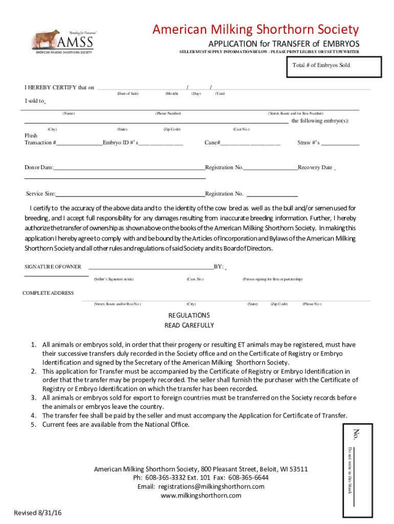 Get the free Embryo Transfer Form - American Milking Shorthorn Society
