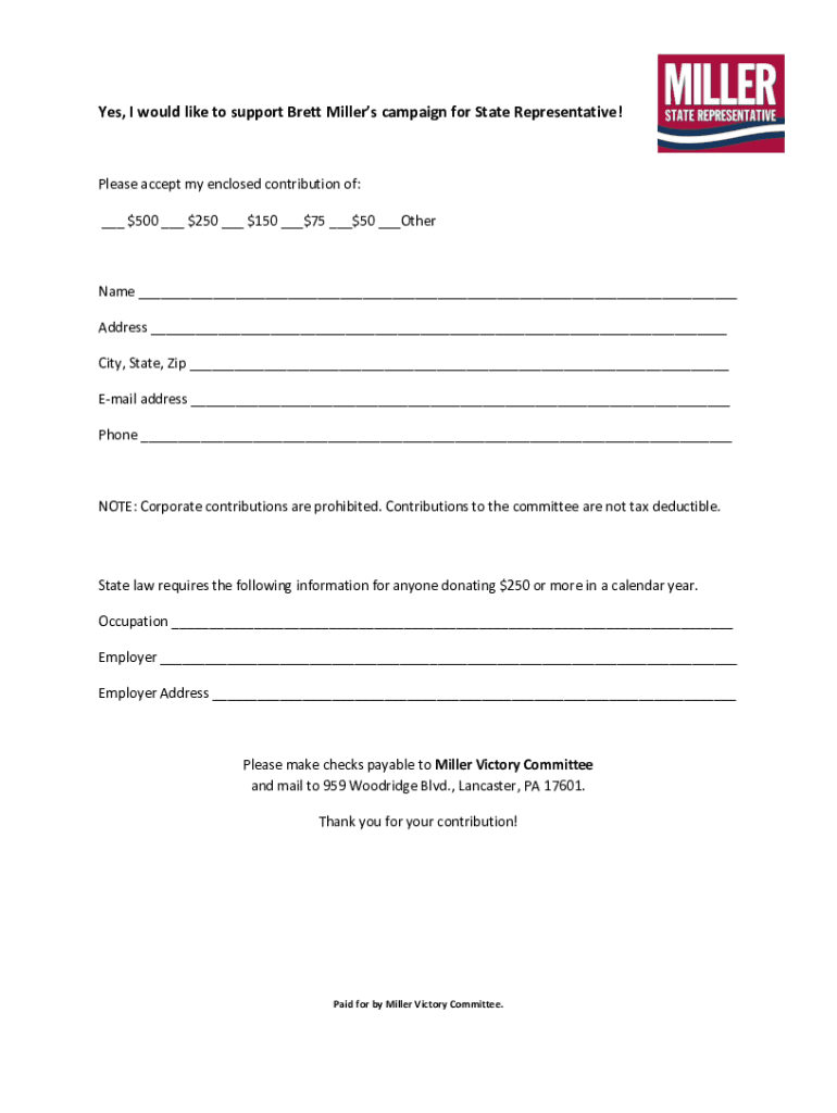 Yes, I would like to support Brett Millers campaign for State Representative! Please accept my enclosed contribution of: $$$$$5002501507550 Otherwise Address City, State, Zip Email address Phone NOTE: